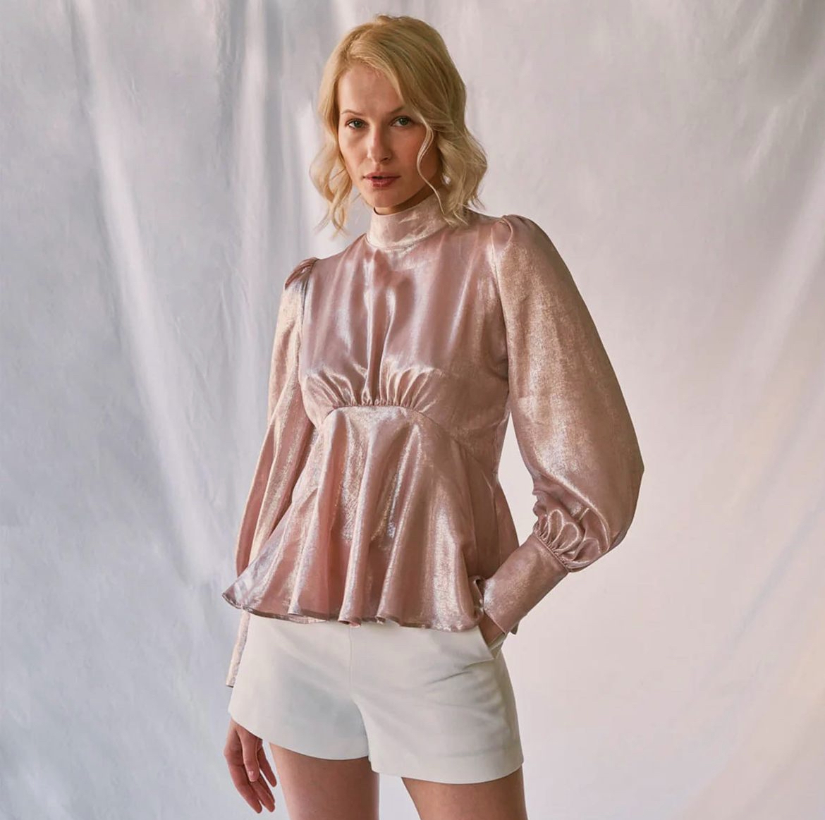 Ici, la blouse lamé «COCO», se dessine avec son col haut, ses manches gigots, ses poignets longs et ses découpes. Elle fait écho à la robe enfant « EMI », le teeshirt garcon « ANGE » et le tee-shirt homme »